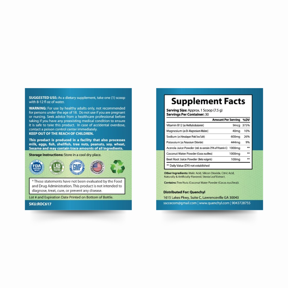 Elevate your hydration experience with Quenchyl, the perfect blend designed to keep you nourished, hydrated, and focused throughout your day, no matter where you are. Crafted with care, our formula combines essential electrolytes and vital vitamins to enhance hydration and promote sustained focus. With ingredients like Beet Root, Vitamin C, Pink Himalayan Salt, Magnesium, Potassium, Coconut Water Powder, and Vitamin B12, Quenchyl offers a comprehensive solution to your hydration needs.